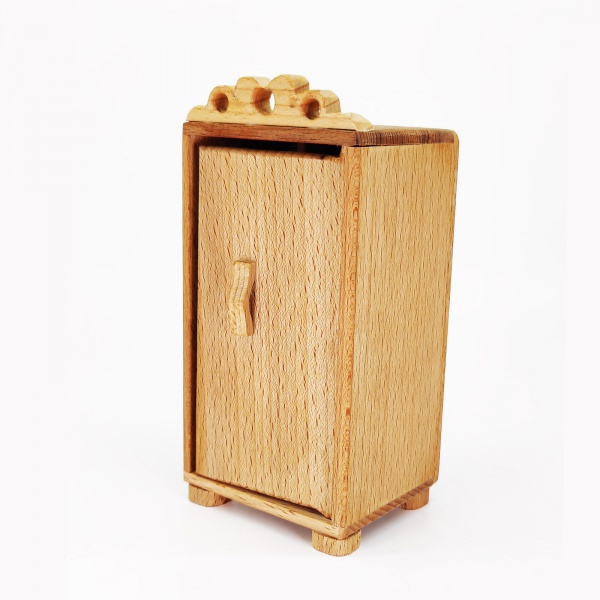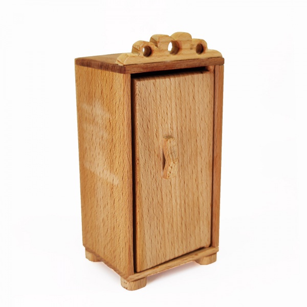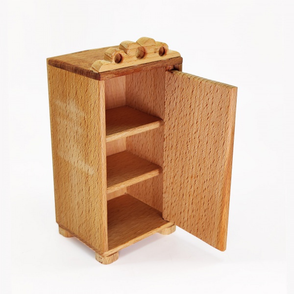 Одностворчатый шкафчик серии Малышка — чудесное пополнение мебельной коллекции уютного кукольного теремка. Дверка открывается на петельках, давая доступ к двум полочкам. Донышко снабжено устойчивыми выступами-ножками. Текстура дерева выделена прозрачной пропиткой. Резной декор.