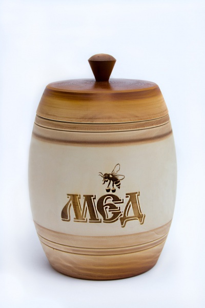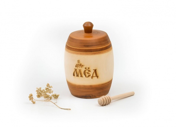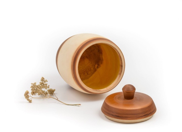 Вместительная толстостенная ёмкость округлой цилиндрической формы гладко выточена вручную из дерева и декорирована в естественных древесных тонах. Плотная коническая крышка с ручкой-шишечкой надёжно закрывает содержимое, создавая идеальные условия для хранения золотого продукта.