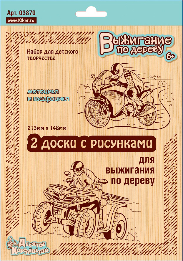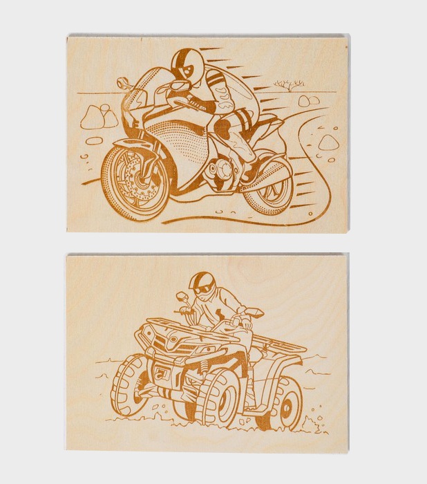 В состав набора входят 2 доски для выжигания с рисунками мотоциклиста и квадроциклиста.