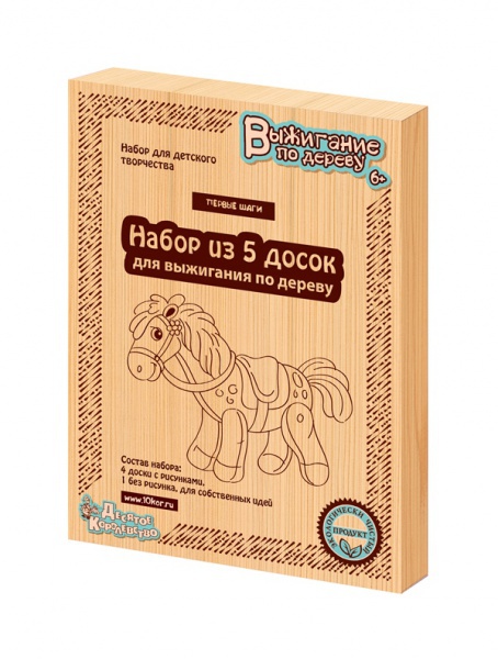 Набор из 5 дощечек для выжигания, предлагающий ребенку от 6-7 лет воссоздать изображение симпатичного рисунка по уже готовому эскизу, а также сотворить свой собственный. Эскиз рисунка нанесен на доску с помощью специальной краски, безопасной при горении. В комплект дополнительно входит чистая доска для реализации фантазий маленького художника. Ребенку, уже знакомому с выжиганием, несомненно, доставит удовольствие обводить мелкие штрихи изображения. Доска для выжигания - желанный и полезный подарок для маленького творца, развивающий не только усидчивость, мелкую моторику рук, ловкость и аккуратность, но и творческие способности. У вас в детстве был выжигатель? Помните это приятно чувство, когда на ровной доске появляется темная рельефная линия? А потом еще, и еще? А потом — светлые легкие штрихи, и вот, уже виден весь рисунок. Повесьте готовые картинки в комнате или предложите подарить друзьям – мастеру будет особенно приятно, что результат его труда оценен по достоинству.