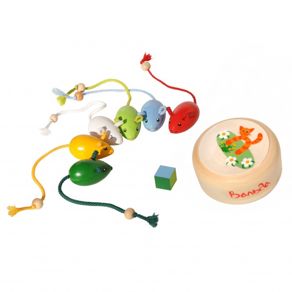 Правила игры : Играют максимально 7 человек . Один игрок становится кошкой - ему дается стаканчик и кубик. Остальные разбирают себе по 1 мышке ( если играет меньше человек, можно управлять сразу 2 мышами ). Игроки располагают своих мышей в центре стола группкой, держа их за хвостики. Кошка выбрасывает кубик и старается поймать стаканчиком мышь выпавшего цвета . Если ей это удается, игроки меняются - кошка становиться мышкой, а пойманная мышка - получает кубик и стаканчик кошки .