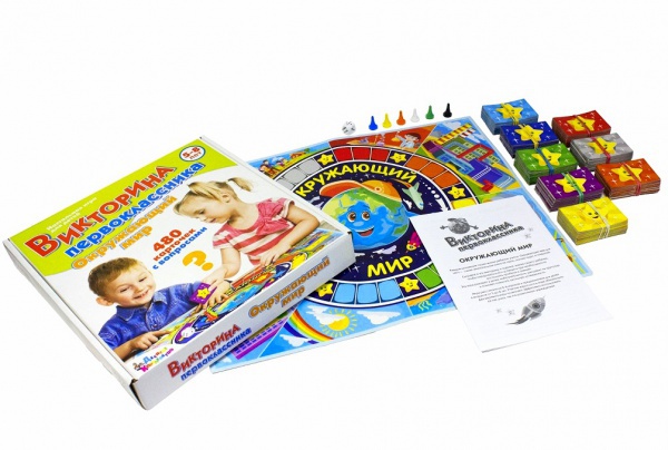 Игра "Викторина первоклассника. Окружающий мир" очень интересна и познавательна, она позволит Вам в игровой форме развивать способности ребенка, давая необходимые знания как для подготовки к школе, так и для закрепления материала, пройденного в первом классе. Игра рассчитана на 2-6 игроков в возрасте от 5 до 8 лет. Участие взрослого в игре обязательно, ведь необходимо контролировать правильность ответов ребенка, направлять, подсказывать и подбадривать! Игра многогранна, её можно использовать как дома, так и в детских образовательных учреждениях. Настольная Игра "Викторина первоклассника. Окружающий мир" развивает у детей любознательность, расширяет кругозор и помогает повысить школьную успеваемость. Сыграйте в эту увлекательную игру и оцените знания ребенка и его подготовку к школе!