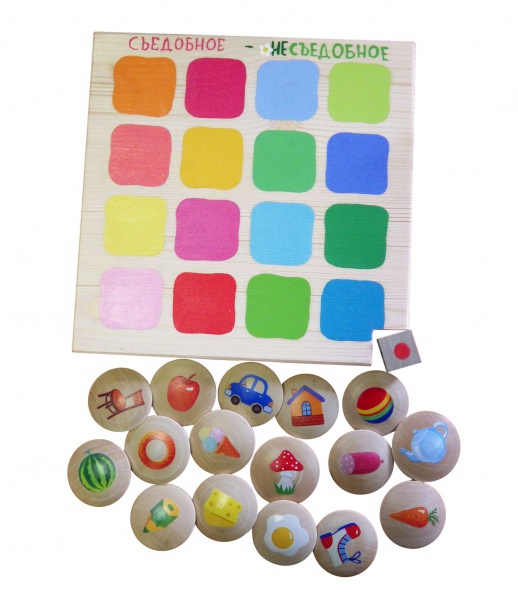 Удивительное исполнение классической игры придется по вкусу всем малышам. Игровое поле, кубик и фишки изготовлены из натурального дерева и окрашены безопасными акриловыми красками. Игровое поле поделено цветом пополам, одна половина для съедобного, вторая половина для несъедобного. На каждой фишке нарисован съедобный или несъедобный предмет. Самым маленьким можно просто предложить рассмотреть эти картинки. А для больших детей существует несколько вариантов игр, предложенных в инструкции. Эта замечательная игра может стать прекрасным подарком.