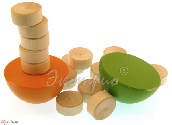 Веселая игра для развития глазомера, ловкости и чувства равновесия ребенка. Может применяться для изучения цифр. А с такой игрушкой ваш ребенок будет с особым рвением тянуться к математике. Игрушка состоит из 2 цветного снования – полушария и 20 неокрашенных деревянных шайбочек.