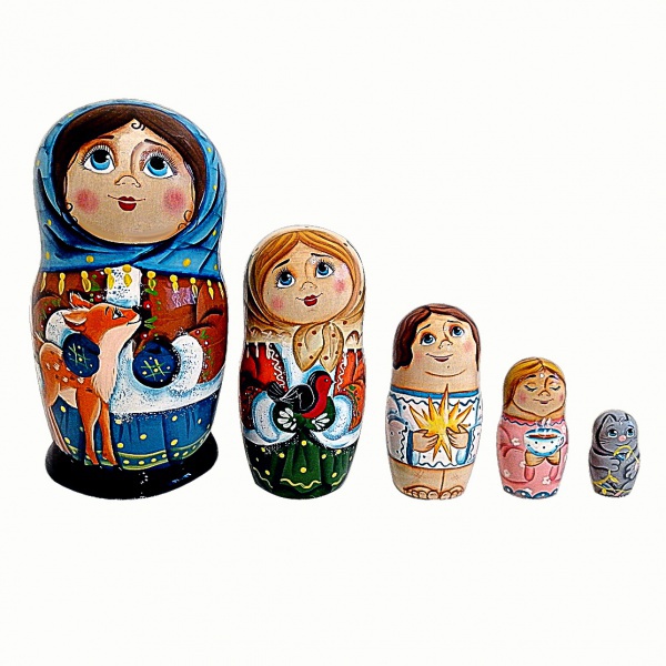 Уютным и оригинальным сюрпризом к празднику станет матрешка «Рождество». Пять деревянных кукол исполнены светлой радости. Каждая не похожа на другую, но вместе они расскажут прекрасную рождественскую сказку. Мама, дочки, сынок со Звездой и даже любимец кот устремляют взоры в небеса — добрые, исполненные счастья, которым они с радостью поделятся с вами.