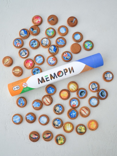Мемори Космос — развивающая игра для дошкольников и школьников младшего возраста, придуманная и выпущенная в России. Круглые фишки из натурального дерева покрыты смесью льняного масла и пчелиного воска.