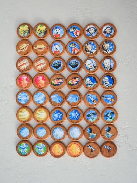 Сверху на каждую фишку наклеена картинка, связанная с освоением космоса. Это и оборудование, и известные личности. Всего изображений — 24, и все они дублируются, поэтому Мемори Космос также называется «парочки».