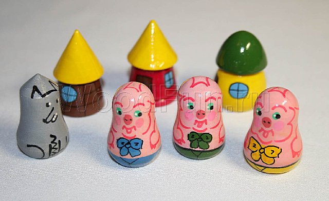 Посмотрите внимательно на трогательных поросят из пальчикового театра 3 поросенка. Какие у них умильные пяточки и трогательные бантики, у каждого своя избушка разного цвета и формы, вот только волк так и хочет нарушить эту идиллию. Если вы играете с ребенок один на один, то оденьте трех поросят на одну руку, а их избушки – на другую и разверните ладони веером, волка поместите на большой палец любой руки. Итак, волка нет (согните большой палец), и поросята выходят погулять – на первом плане соответствующая рука, тут появляется волк – резко поменяйте руки, и тогда поросята спрячутся в своих домиках, и волк останется ни с чем!