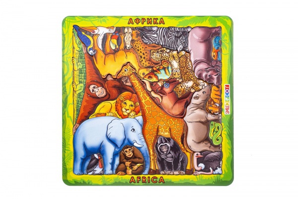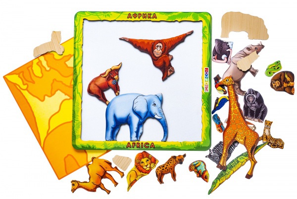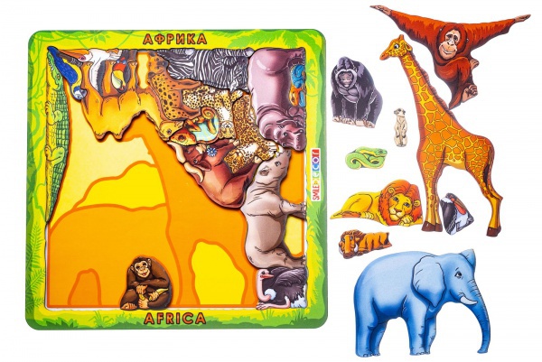 1. Игра «Сафари». Рассмотрите пазл вместе с ребенком. Назовите, какие животные живут в жарких странах? Обсудите внешний вид каждого животного, его повадки, чем питается. Спросите, кто из них умеет плавать? Ползать? Летать? Быстро бегать? У кого есть бивни? Рога? Копыта? Кто может менять свою окраску? Кто обитает в саванне? В пустыне? Чьи детеныши вылупляются из яиц? Попросите найти и посчитать всех обезьян, птиц, представителей семейства кошачьих.