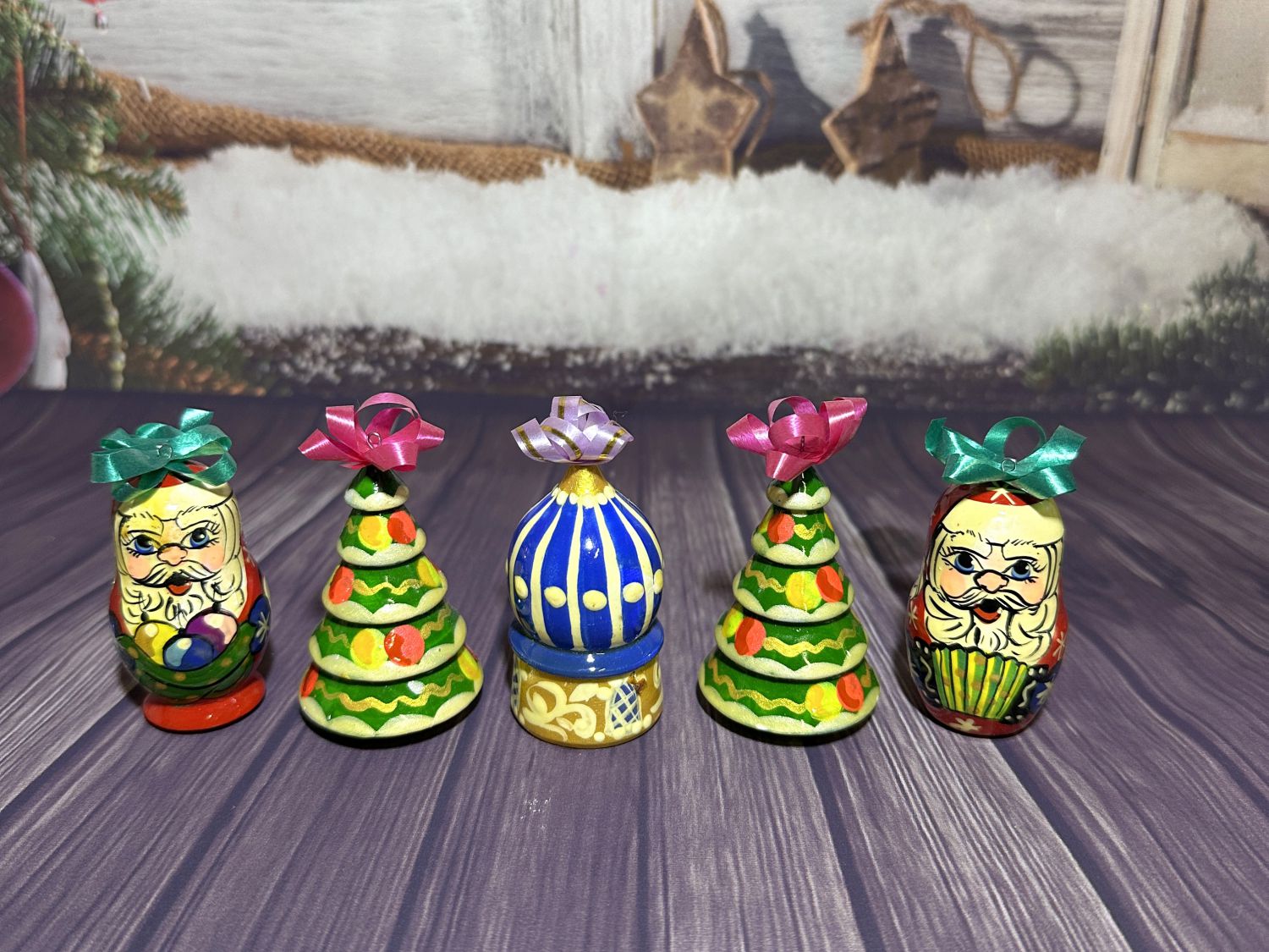 Художественная роспись по натуральному дереву украшает каждую из пяти фигурок, входящих в новогодний набор.