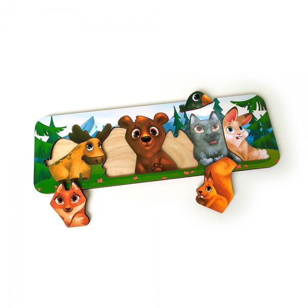 1. Внимательно изучите рамку-вкладыш перед игрой. Определите, какие животные представлены в рамке-вкладыше. Найдите лося, медведя, лису и остальных животных