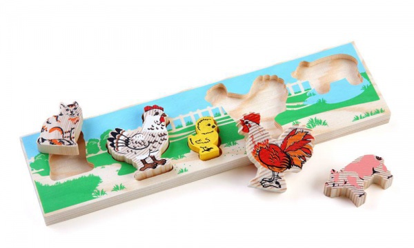 Игрушка сделана из натурального дерева, подойдет детям от года. С помощью этих оригинальных вкладышей малышу можно рассказать об увлекательной жизни на классной ферме, со всеми ее птицами и животными.