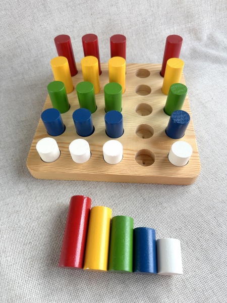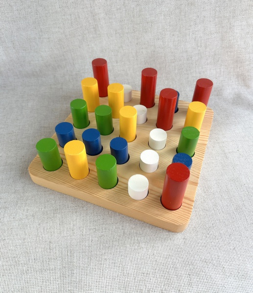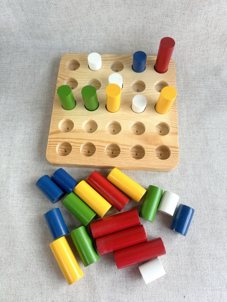 Развивающая настольная игра, представляющая собой деревянное поле 20х20 см и 25 цветных деревянных цилиндров одинакового диаметра (2см) и разных по цветам и высоте. Всего используется 5 цветов (белый, желтый, красный, синий, зеленый) и 5 различных высот цилиндров (3, 4, 5, 6 и 7см).