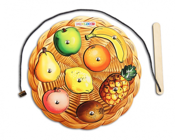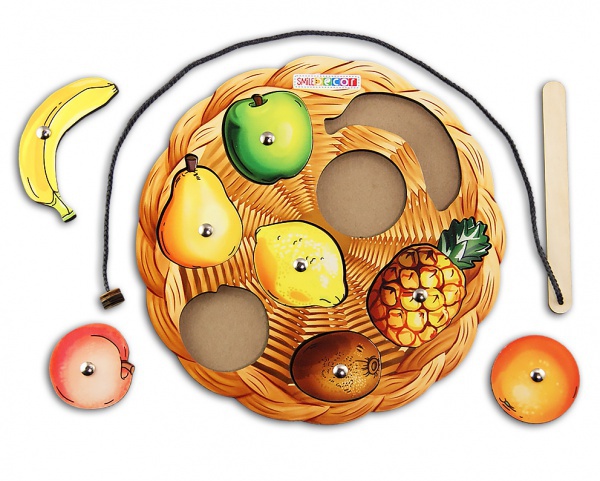 1.    Игра «Фруктовая корзина». Рассмотрите корзину с фруктами вместе с ребенком. Назовите, какие фрукты лежат в корзине (банан, яблоко, груша, апельсин, ананас, киви, персик). Попросите найти, например, апельсин. Если фрукт найден верно, предложите достать его из корзины с помощью магнитной удочки. Если ребенок ошибся, фрукт остается на игровом поле. В конце игры посчитайте фруктовый урожай.