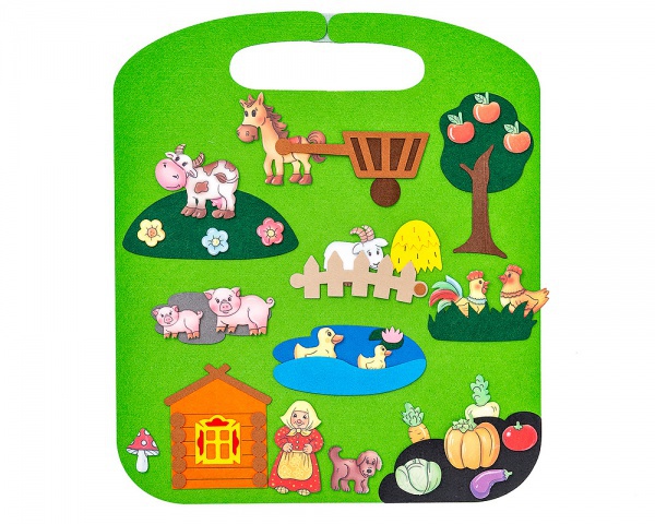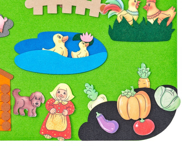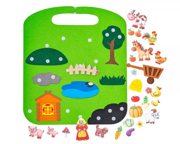 2.    Игра «Деревенский дворик». Разложите перед ребенком все детали, затем вместе разместите их на коврике. Задавайте ребенку вопросы, вовлекая его в диалог.