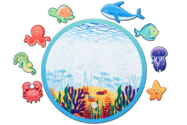 1. Игра «Подводный мир». Рассмотрите «Аквариум» вместе с ребенком. Спросите, кто живет под водой? Попросите найти и показать рыбку, краба, осьминога, морскую звезду, черепашку, морского конька, кита, медузу, водоросли.