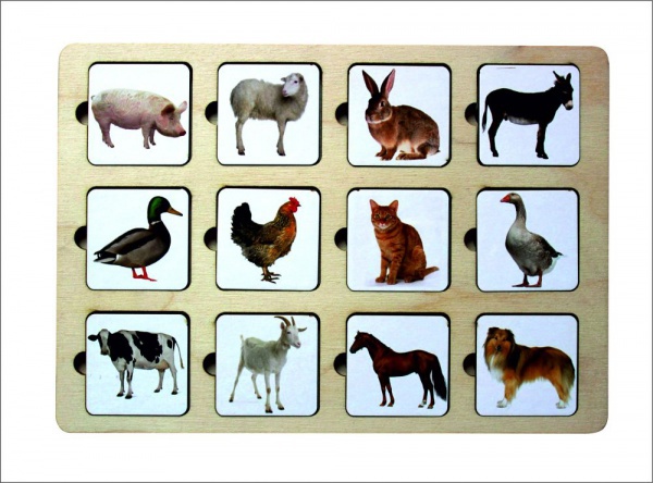 Набор картинок-вкладышей с симпатичными изображениями домашних животных. На картинках не только распространенные животные, которых ребенок мог видеть, но и ослик, лошадь, гусь, овечка.