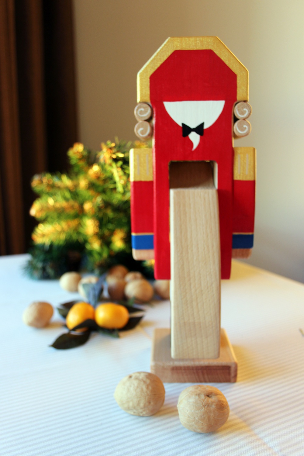 Яркую сувенирную игрушку можно бесконечно долго использовать по назначению. Вставляем фундук или грецкий орех в пасть великану, жмём на рычаг. Готово! На крепком деревянном язычке ни единой царапины.