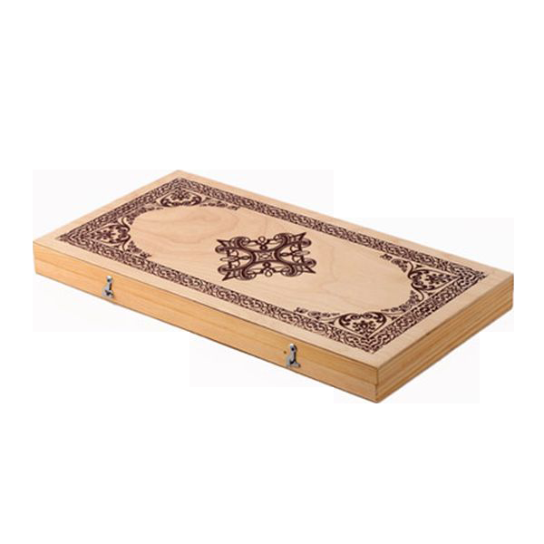 Нарды изготовлены из натурального дерева. Игровая доска одновременно является коробкой для хранения шашек — их по 15 штук каждого цвета. В комплекте идут два кубика.
