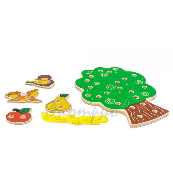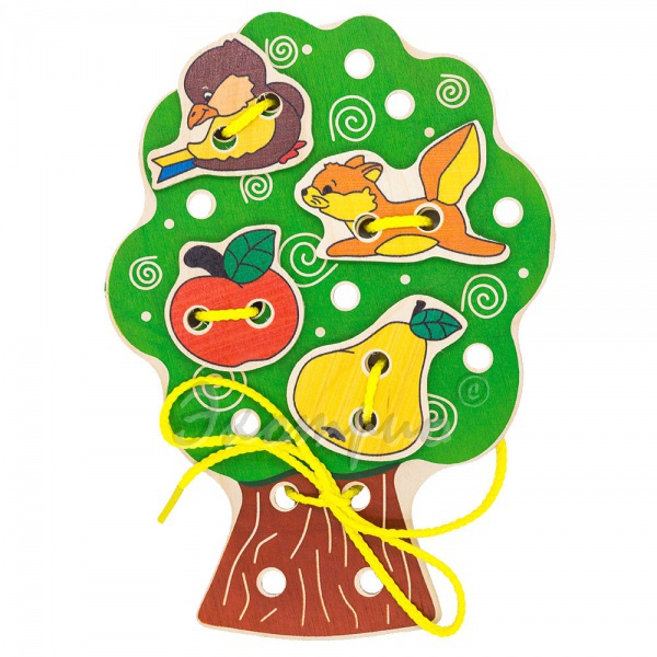Развивающей доской Шнуровка Белочка на дереве можно полюбоваться только в том случае, если детали будут правильно сошнурованы друг с другом. На густой кроне дерева созреют яблони и груши, поселятся птичка и белка. После такой весёлой тренировки ребёнок без труда справится со шнурками на собственных ботинках. Игрушка развивает координацию рук, тренирует ловкость захвата.