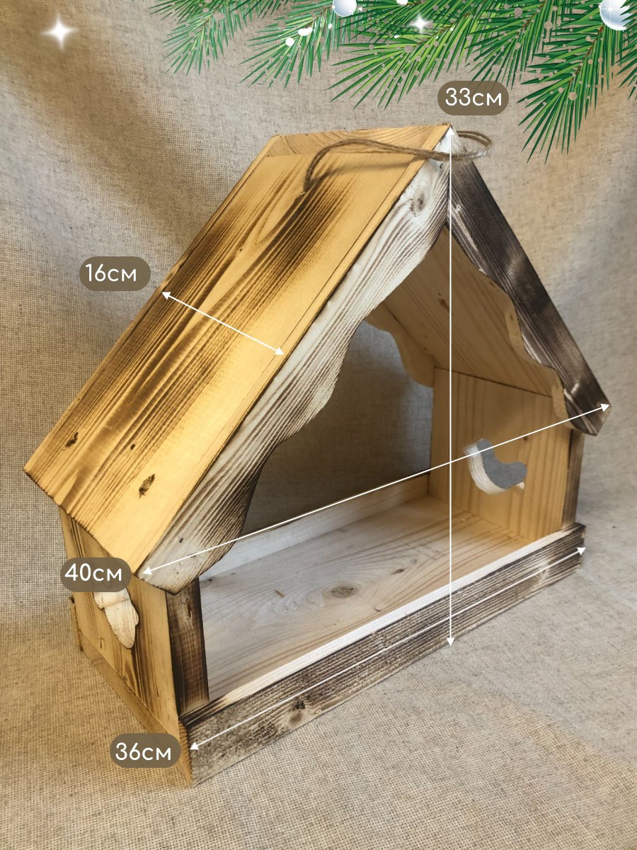 Кормушка для птиц WoodFun — стильное и функциональное изделие, выполненное из натурального дерева с эффектом обжига, что придаёт ей особую эстетичность. Благодаря большим размерам (40x33x16 см) кормушка вмещает достаточное количество корма, обеспечивая птиц едой в холодное время года. Конструкция с продуманными отверстиями для доступа позволяет птицам легко находить корм, а крыша защищает содержимое от дождя и снега, сохраняя его сухим.