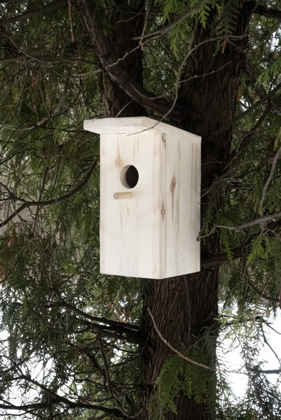 В качестве крепления скворечника к вертикальной поверхности предусмотрено отверстие в задней стенке скворечника для устройства подвеса.