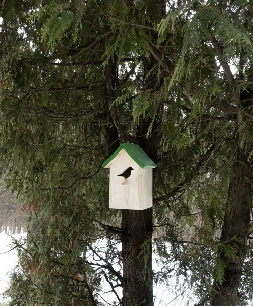 В качестве крепления скворечника к вертикальной поверхности предусмотрено отверстие в задней стенке скворечника для устройства подвеса.