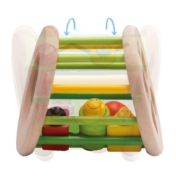 Этот сортер интересен тем, что он прозрачный, и жучки, которые попадают в отверстия все равно видны ребенку. А также сбоку у сортера есть небольшая панель с пазами, по которым жучки могут передвигаться.
