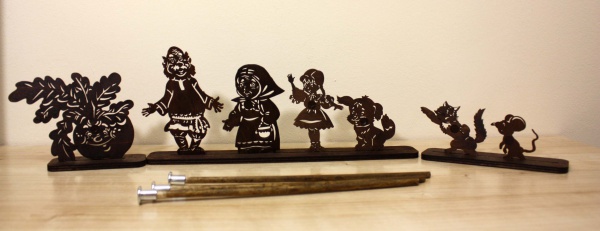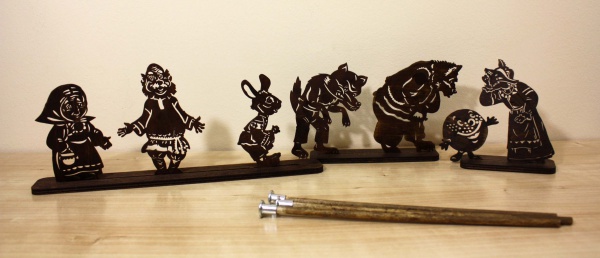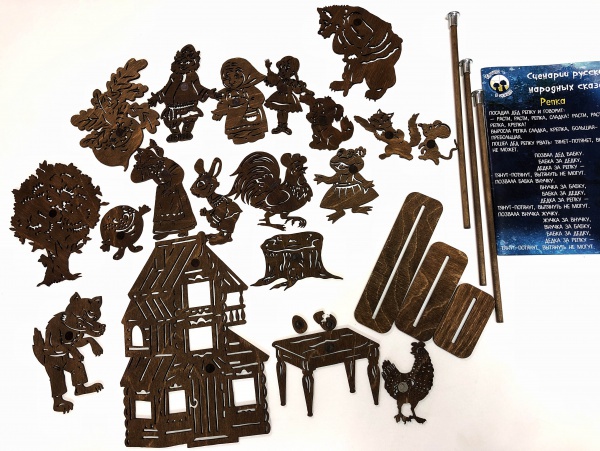 В наборе 17 фигур: яйцо (целое и разбитое), кот, собака, дед, бабка, репка, петух, девочка, медведь, волк, заяц, лиса, курочка, колобок, мышка, лягушка. Имеются также декорации — пень, теремок и стол. Для разыгрывания спектаклей на столе в комплекте имеются три подставки. А при помощи двух держателей с металлическими наконечниками фигурки становятся персонажами театра теней.