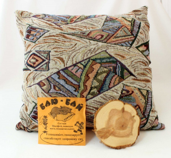 Эргономичная квадратная подушка сшита из прочной воздухопроницаемой ткани и обита хлопковым гобеленом с этническими мотивами. Кладите её под голову. Полезно. Тепло. Удобно. Приятных снов.