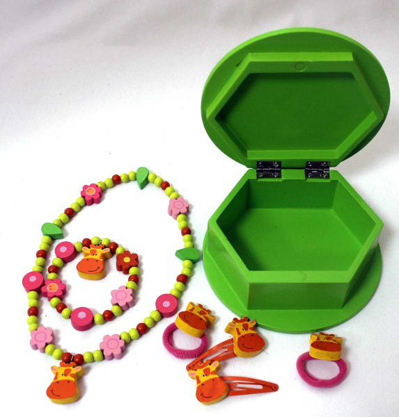Милая компания из браслетика, разноцветных бус и заколочек в цветной деревянной шкатулочке. Взрослые украшения не подходят маленьким принцессам. Зато для принцесс есть специальные украшения, которые будут очень симпатично смотреться и уж точно не прибавят возраста. Очень удобно и практично все это можно сложить в деревянную шкатулочку – прямо как мама убирает свои украшения, когда не носит их! Так девочки будут приучаться держать свои "дамские мелочи" в порядке.