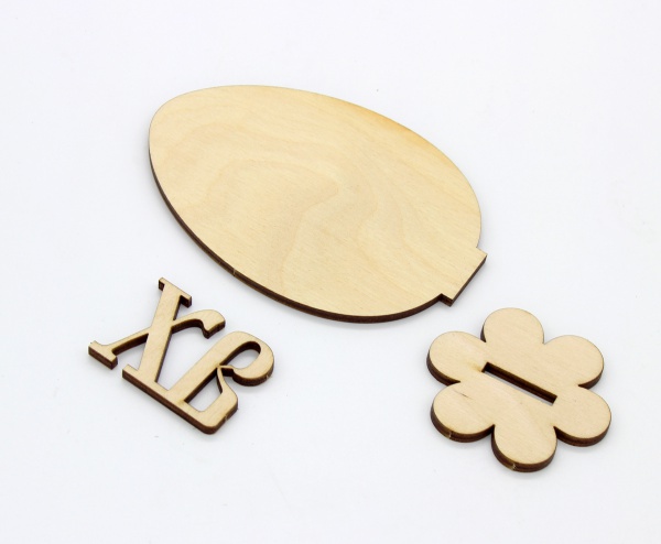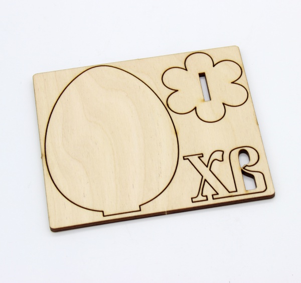Пасхальный набор для росписи выполнен прорезью на плотном неокрашенном листе фанеры. Плоские элементы сувенира легко отделяются нажатием большого пальца и собираются в вертикальную композицию, дополненную буквенными символами ХВ. Берём краски и сотворяем чудо. Христос Воскрес!