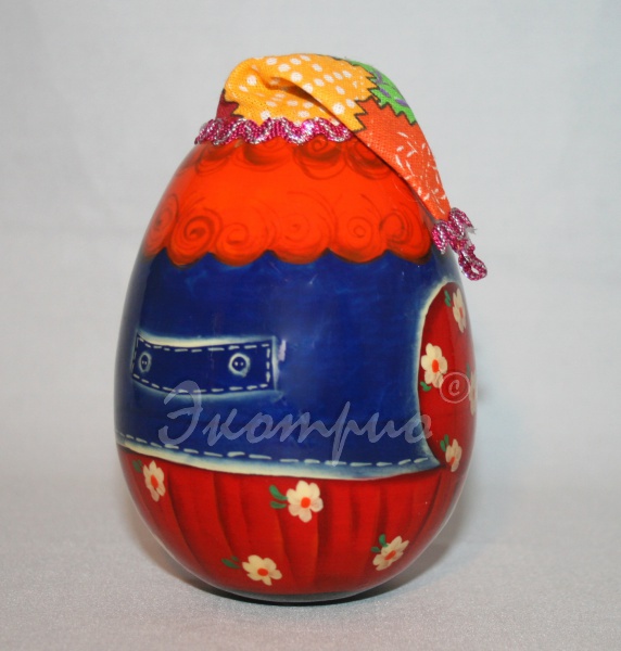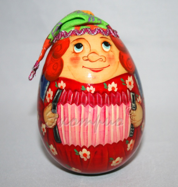 Кто может развлечь ребёнка и вызвать искренний смех у взрослого? Конечно, этот скоморох с гармонью. Яркая игрушка-неваляшка просто не может не понравиться. Стоит только взглянуть на забавно нарисованное личико и улыбка появляется сама собой. Малышу будет интересно трогать и толкать скомороха, ведь он не падает, ещё и при движении издаёт приятные мелодичные звуки. Разукрашенное вручную яйцо сделает радужной не только жизнь ребёнка. Такой скоморох, подаренный в качестве сувенира, порадует любого взрослого.